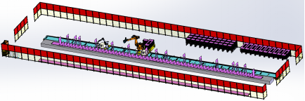 主梁內(nèi)筋板焊接線采用雙機(jī)單工位布局,兩臺(tái)機(jī)器人固定在同一工作臺(tái)上,一臺(tái)機(jī)器人自動(dòng)上下料(內(nèi)筋板焊合件)的同時(shí),另一臺(tái)焊接機(jī)器人對(duì)工件(主梁內(nèi)筋板)實(shí)施焊接,在機(jī)器人臺(tái)的作用下完成整件的焊接任務(wù)。