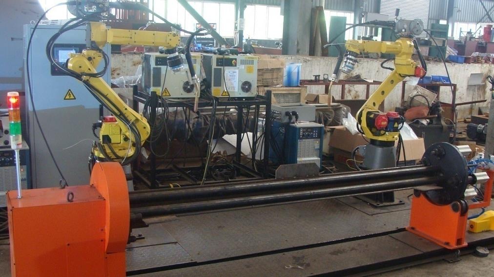 包含長臂焊接機器人、機器人安裝底座、單軸氣動變位機、兩軸伺服變位機、焊接工裝夾具(針對客戶工件進行設(shè)計制造)、機器人控制系統(tǒng)、機器人示教器、焊接電源、機器人專用焊槍、外部控制盒。