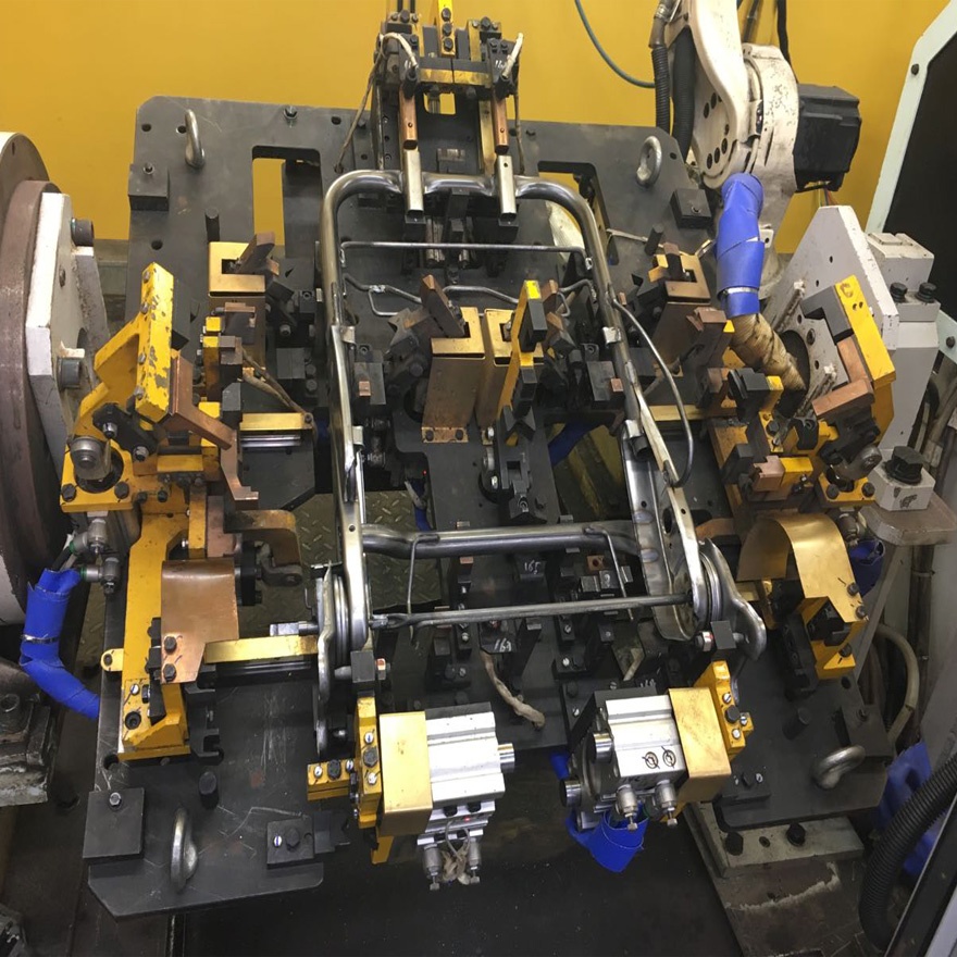 為了解決上述問題,本發(fā)明的技術(shù)方案是:一種汽車座椅焊接包括焊接一種汽車座椅,所述汽車座椅包括靠背框架,所述靠背框架的下部設(shè)置有座椅骨架,所述靠背框架有一個,所述靠背框架包括安裝在底桿兩側(cè)的左側(cè)桿和右側(cè)桿,所述左側(cè)桿和所述右側(cè)桿的頂端之間橫向連接有上蛇簧,所述上蛇簧中部設(shè)有圓環(huán)狀的上擋圈,所述左側(cè)桿的頂端與所述底桿的中部傾斜連接有左蛇簧,所述右側(cè)桿的頂端與所述底桿的中部傾斜連接有右蛇簧,有一左擋圈通過三根連接桿與所述左側(cè)桿的頂端和所述左側(cè)桿的底端及所述底桿的中部連接,有一右擋圈通過三根連接桿與所述右側(cè)桿的頂端和所述右側(cè)桿的底端及所述底桿的中部連接,所述上擋圈、所述左擋圈、所述右擋圈和所述連接桿均采用柔性材料制成;