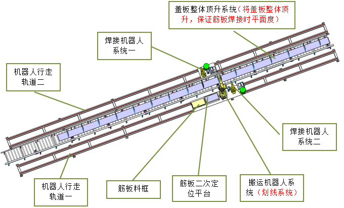 主梁全自動(dòng)焊接生產(chǎn)線包括:上蓋板及筋板組焊工位、腹板與角鋼拼焊工位、π型梁組對(duì)工位、內(nèi)縫焊接工位一、內(nèi)縫焊接工位二、梁盒組對(duì)工位、外縫焊接工位一、外縫焊接工位二、檢測(cè)工位、信息化系統(tǒng)、物流系統(tǒng)及智能控制系統(tǒng)組成